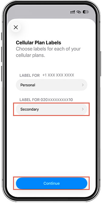 Tap “Continue” to change cellular plan labels